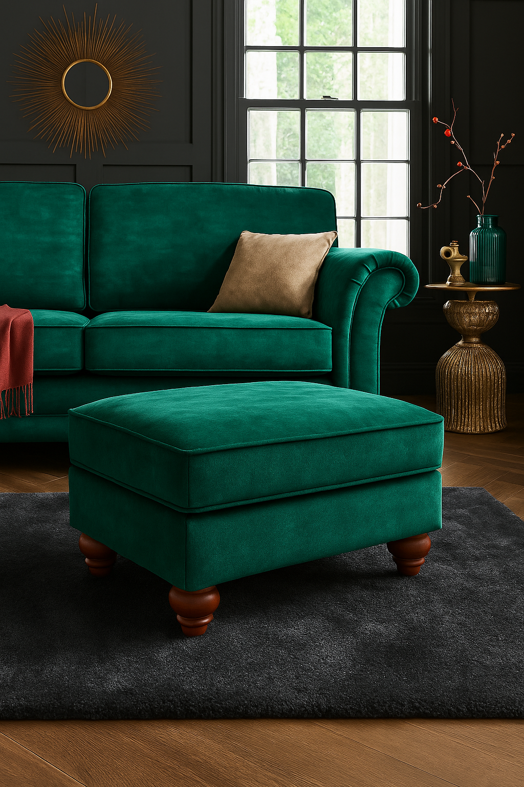 Genoa Handmade Footstool In Milano Emerald Green Fabric With Turned Wooden Legs