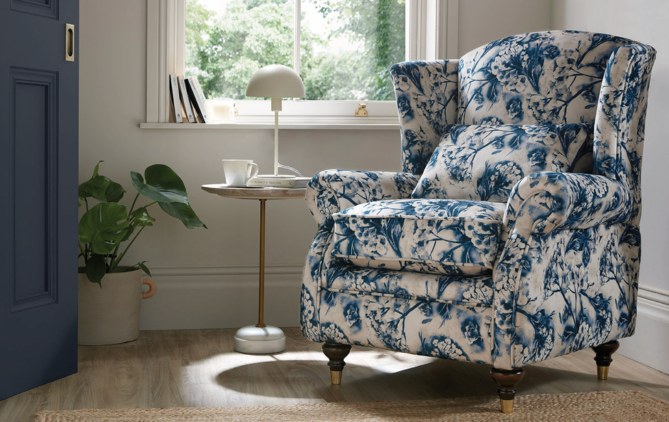 Add a statement piece to your room with the Windsor Accent Chair, featuring a beautiful blue floral print on a soft cream background. With its elegant winged back, deep seat cushion and curved arms, it offers comfort and timeless style in one.